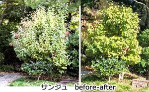 | 久しぶりの剪定で基本的なポイントである枯れ枝、ヒコバエ、密集枝、平行枝等を中心に思い出しながら剪定作業を行いました。先生からの説明で樹木の種類や状態によってポイントが異なり、高さを低くしたり、花芽や葉を残して切りすぎない等を教わりました。また、依頼主の要望を聞いて残す場合もあることも重要と知りました。剪定の難しさや奥の深さをさらに実感しました。 |