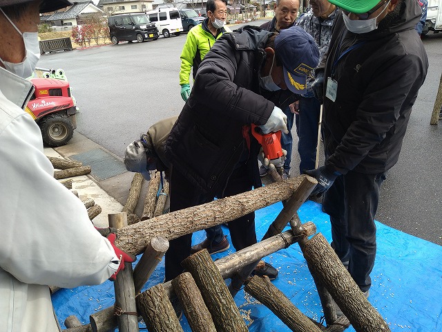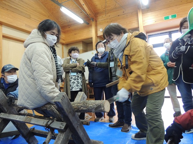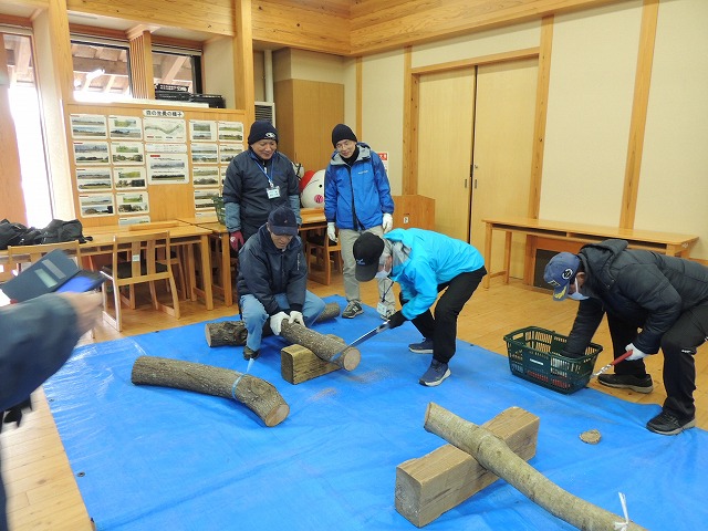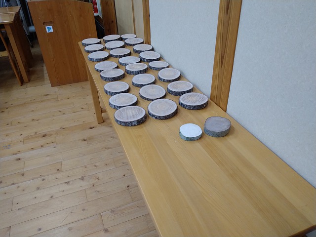 中止となり、森づくりセンターのセミナールームで、間伐材の丸太を、折り畳みのこぎりで、厚さ3cm程度に輪切りする