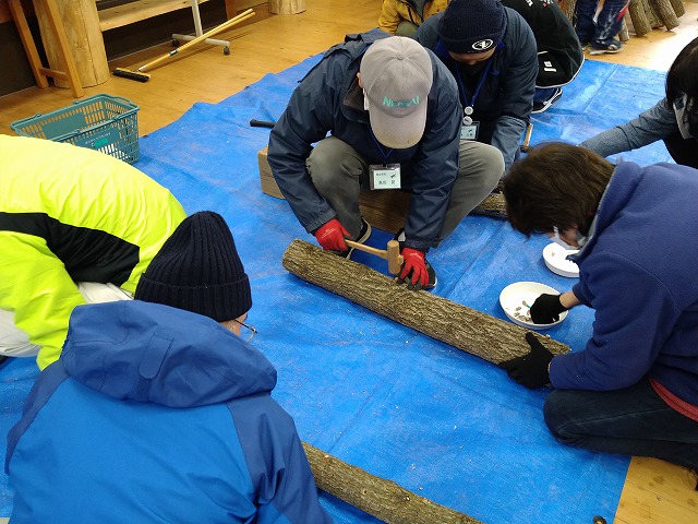 間伐材を長さ1mぐらいに切った原木を選び、菌を打ち込む穴を電動ドリ ルを使ってあけました。太い原木の場合は、