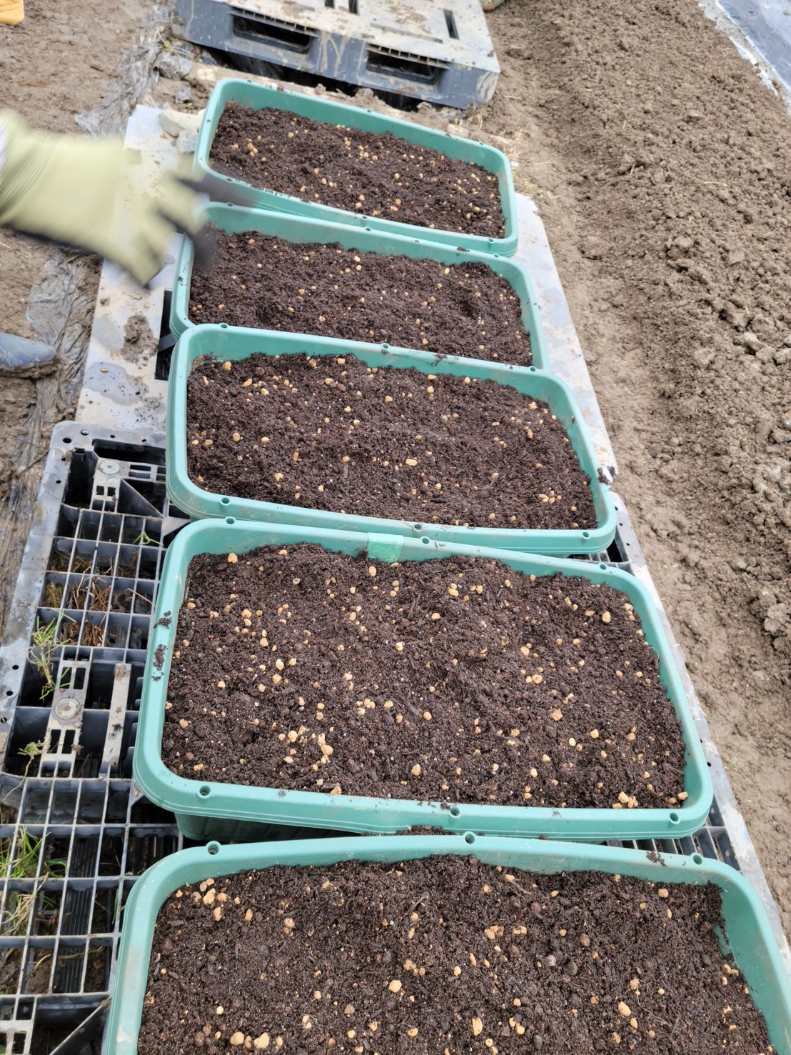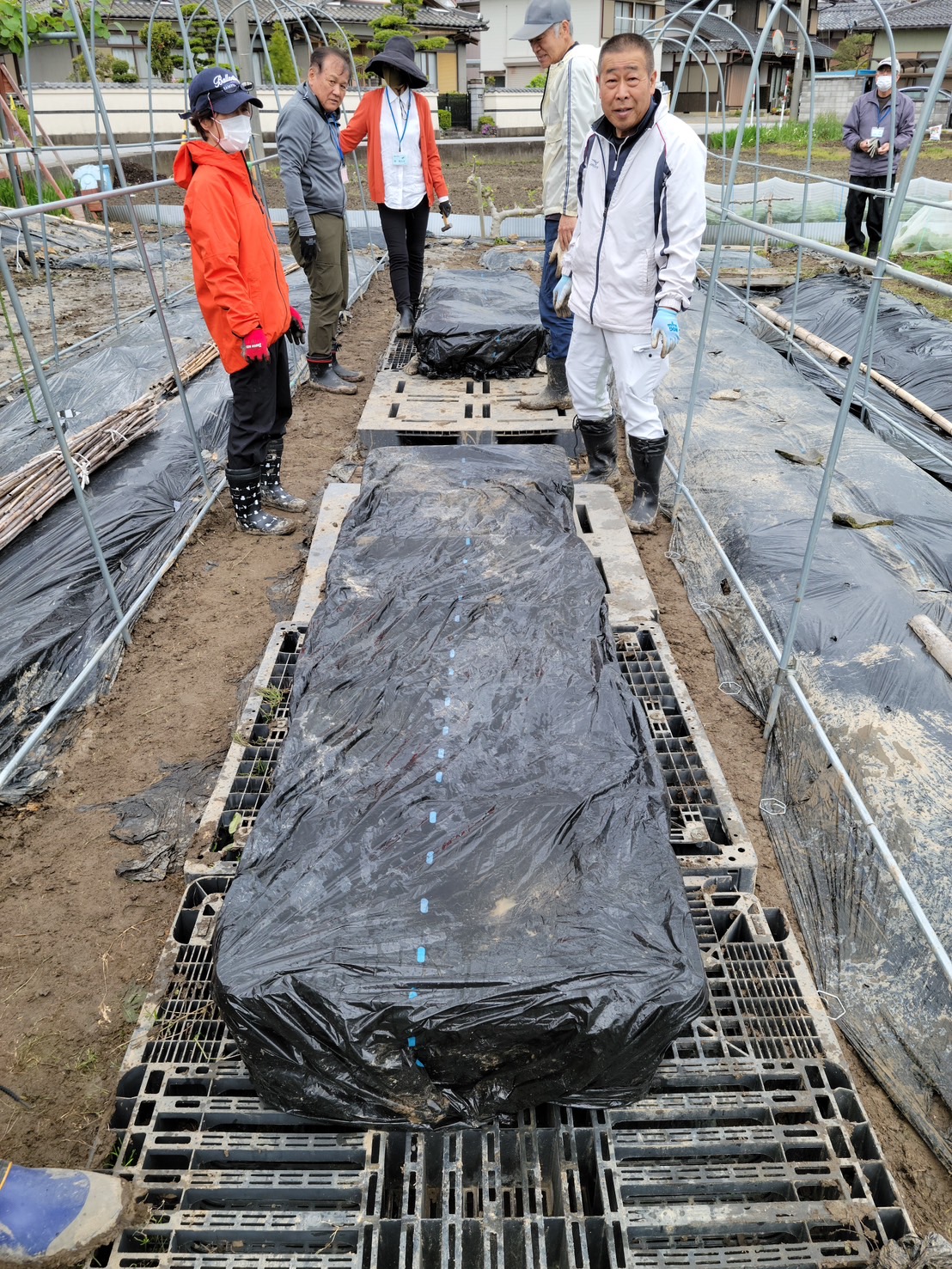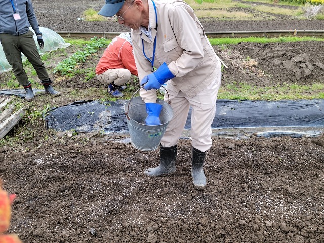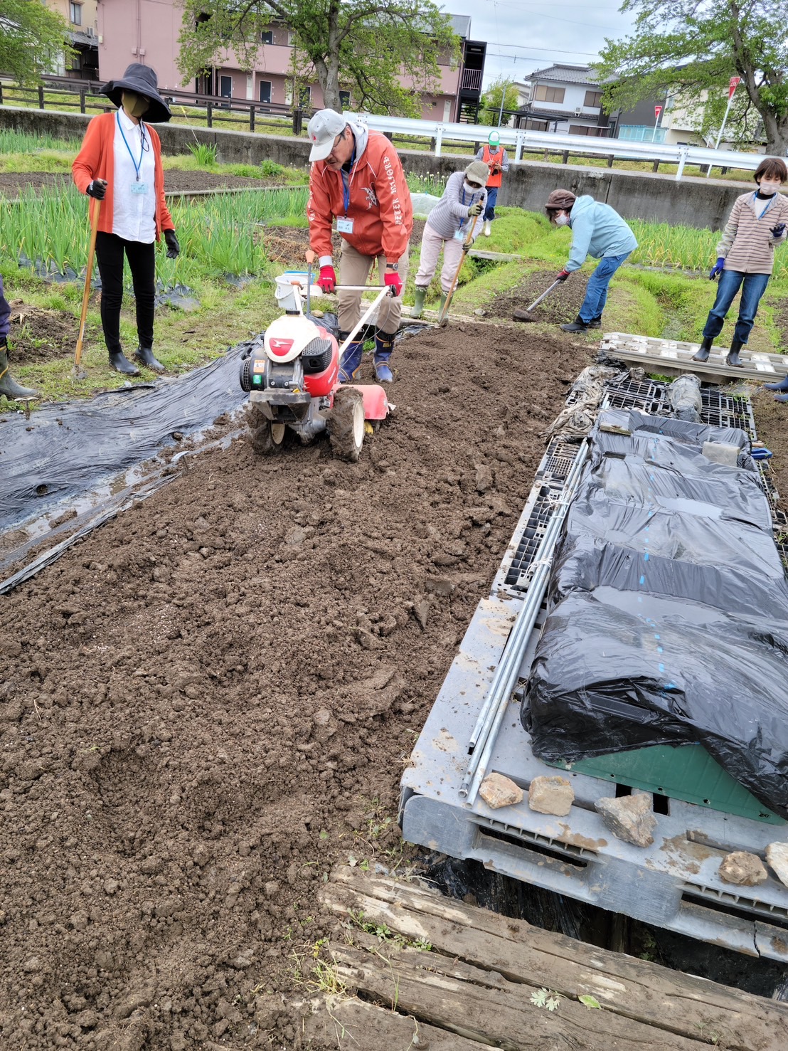 1年生用の畑を小型耕運機で耕し、数種類の肥料等を施す。その後マルチで畑を覆う。