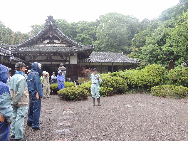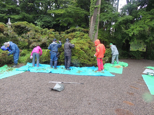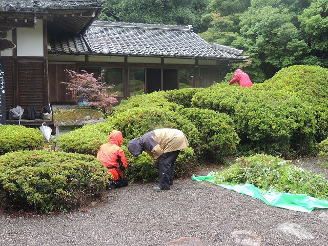あいにくの雨の中、雲迎寺の庭のさつきを中心に班に分かれて剪定を行った。雨の強い時は休憩もとりな