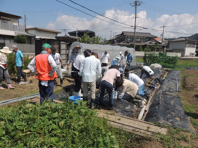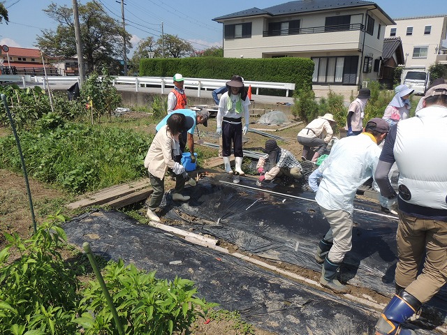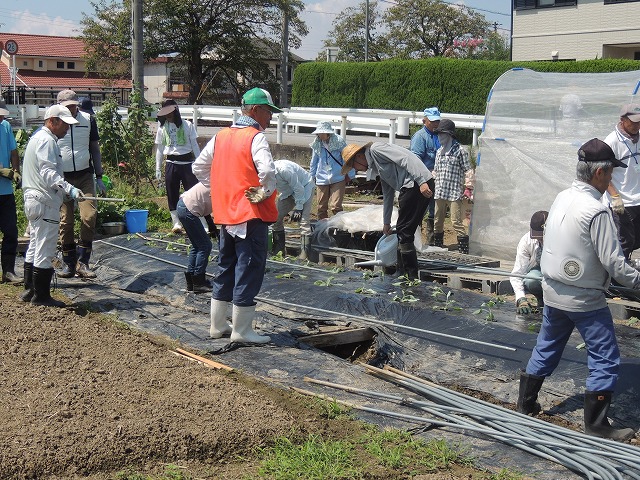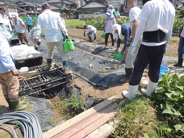 ホーラーで穴をあけて白菜の苗を植えてるところ