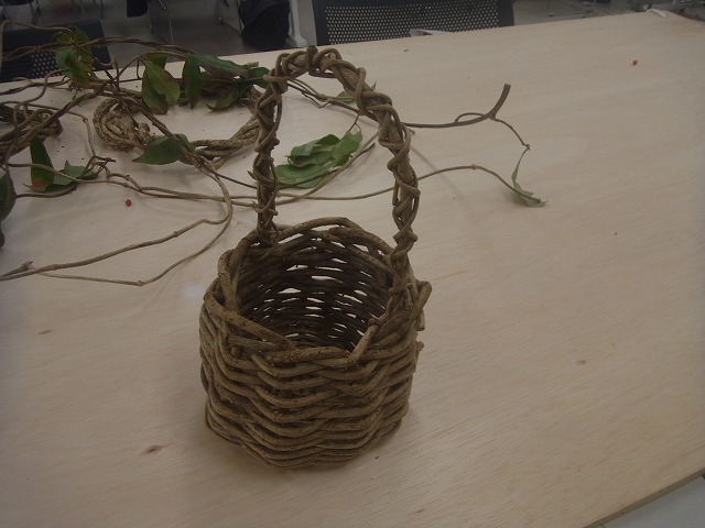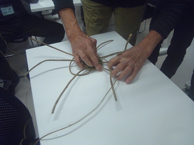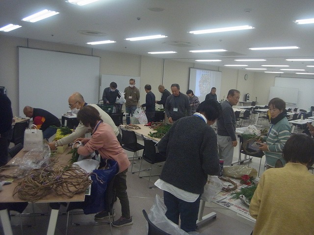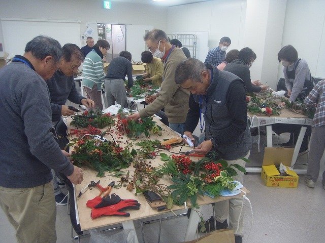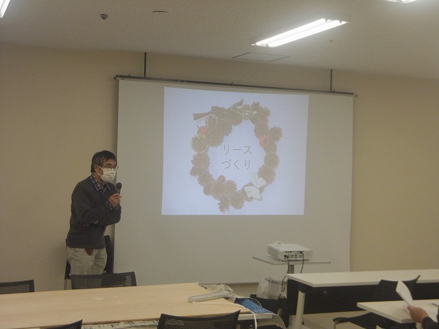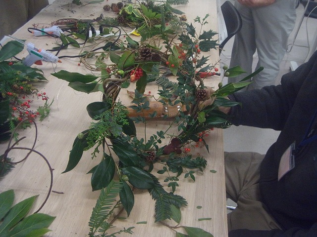 事前に用意されたつるや松ぼっくり・木の実などの材料と、各自が持参した材料を使ってのリースづくり