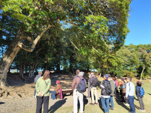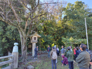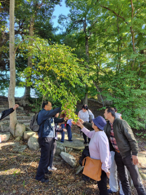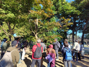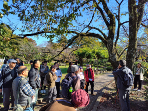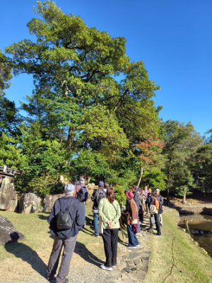 午前中の座学に続いて、午後は初めての校外学習でした。晴天のもと、護国神社~玄宮園を全員で散策しながら、信田先生に、一つ一つの木の名前を教えていただきました。