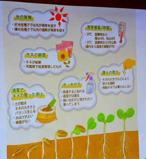 午前中は、花の種まきの講義がありました。発芽の3条件、開花の3条件の説明がありました。水をやり過ぎると、酸素不足になって発芽しないことを勉強しました。
