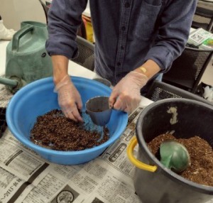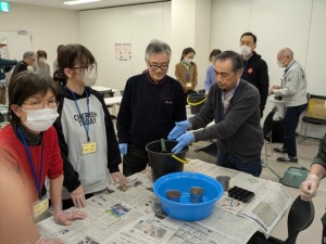 午後は実習として、種まき用の土を使用して、土の湿らせ具合の感覚を、実際の手で実感しました。