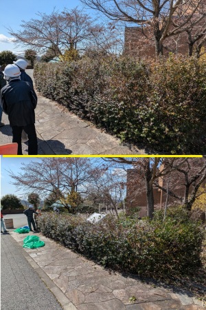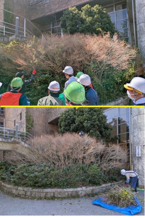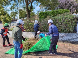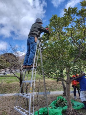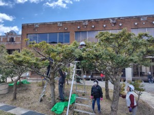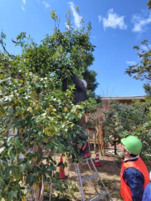 | 校外学習として、現場での樹木管理実習を行いました。チームに分かれ、サポートの会の支援を受けながら、実際の樹木剪定を行いました。