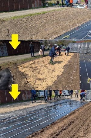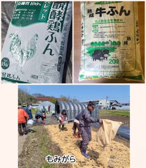 | 担当エリアは3m×9m 約30平米の土作り 肥料投入: -有機物 バーク堆肥eco 60L 完熟発酵牛ふん 60L 発酵鶏ふん 25kg もみがら 30L 水はけ、通気性 -石灰 苦土石灰 3kg -化成肥料 砂状ヨウリン 2kg ダイナミックス10 2kg ゴールド興産 10-12-10+微量要素(ミネラル等) |