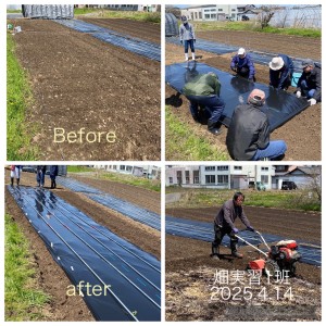 | 畑実習 1班 2025年4月14日 2班 2025年4月16日 春の家庭菜園 (土つくり・植え付け準備) (松原治夫先生) |
