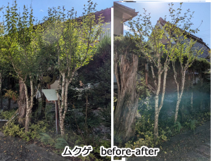| 久しぶりの剪定で基本的なポイントである枯れ枝、ヒコバエ、密集枝、平行枝等を中心に思い出しながら剪定作業を行いました。先生からの説明で樹木の種類や状態によってポイントが異なり、高さを低くしたり、花芽や葉を残して切りすぎない等を教わりました。また、依頼主の要望を聞いて残す場合もあることも重要と知りました。剪定の難しさや奥の深さをさらに実感しました。 |