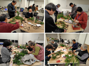本日は、彦根キャンパスでクリスマスリースづくりの実習です。リースの材料は先生と各自(用意できる方)が、アケビのツル、松ぼっくり、スギ、ヒイラギ等を持参されました。各自が好みの材料を選択し、グルーガンと細い針金を使って材料を固定して、クリスマスリースを完成させました。![]() |
