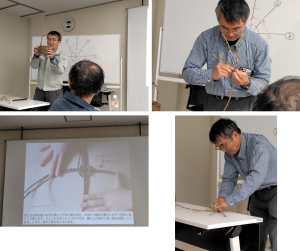 | 午後は、まずアケビのツルを使ったツルカゴ作りの実演がありました。3種類の長さのツルを使って十字に組み編んで作成されました。植物の材料(ツル)を使った楽しみ方の紹介です。興味を持たれた方はチャレンジされると思います。 |
