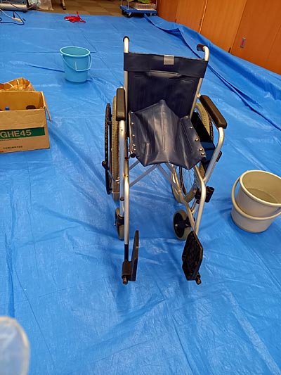 病院内の車椅子を2人1組で、ほこり落とし、錆、汚れがある個所を研磨します。