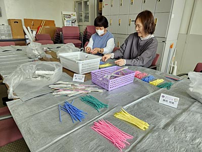 不良品のろうそく(ケーキに用)を袋から取り出し、銀紙をはがし、ろうそくを色ごとに仕分けする作業です。