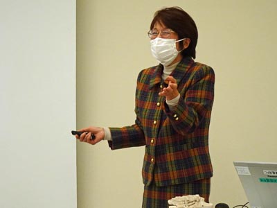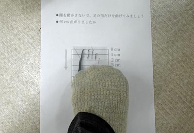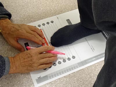 午後は、介護予防の方法、特に「あなたの足(足首から下)は元気ですか?」で、正しい歩き方、足のつくり、足の生活習慣病、靴の選び方と履き方、足のケア、元気に歩けるための筋力体操の項目について講義でした。足のつくりでは、各自の足指の柔軟性を測り、靴の選び方と履き方では、各自の足の足長、足囲を測って適正な靴のサイズを求めた。 |