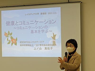 午前は、コミュニケーション基本についての講座であった。コミュニケーションの流れは、受信→処理→送信から成り立っている。コミュニケーションには、言語系コミュニケーションと非言語系コミュニケーションがあり、非言語系コミュニケーションには視線、表情、姿勢、身振り・手振り、声の調子や大きさなどがあるなどのコミュニケーションの基本を教わった。 |