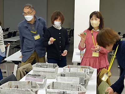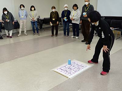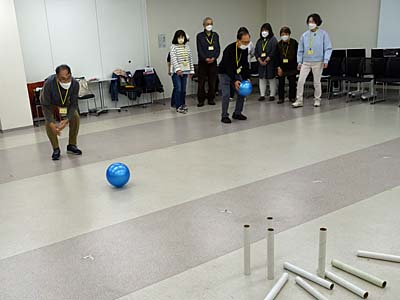 軽スポーツ コップinゴルフ、じゃんけんサッカー、ボーリング(サランラップとソフトボール)、風船バレーを実践。
