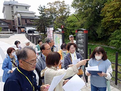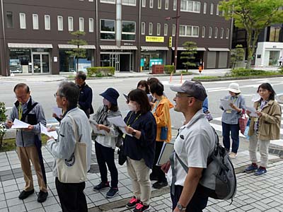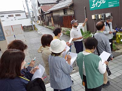 平和堂の周辺でウォークラリーの地図を見ながら、進め方を説明いただいた。